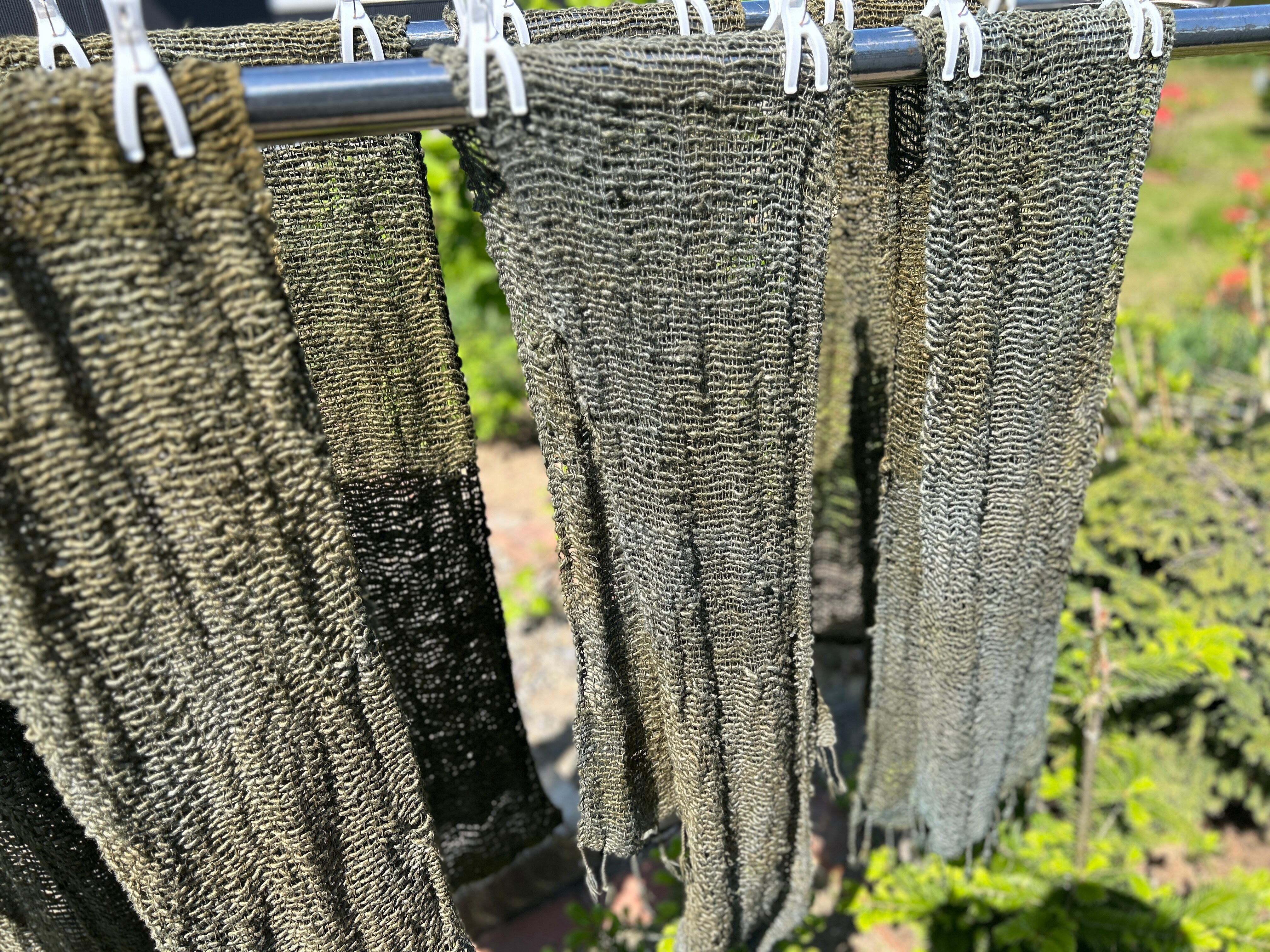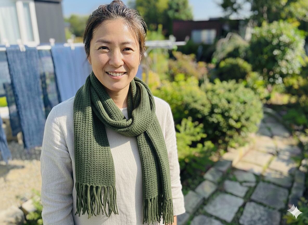 綿・羊毛のざっくり編みストールです。 下川産ヨモギで手染めしました。 色は、深いモスグリーン色。 常盤鉄(ときわくろがね) 草木染めならではのやさしい色合いで、 年齢を問わずお洒落に決まるあみあみストール! 生地は、ラフに編まれていて、 ふんわりと巻くことができます。 小さく畳んでカバンに入れておくと、エアコンの冷えすぎや涼しい夕方など、さまざまなシーンで活躍します。 《素材・材料》 ・布地:綿、羊毛 ・染料・媒染剤・助材:下川産ヨモギ、銅溶液 ※繊細な生地のため引っかかりや摩擦にご注意ください。 《サイズ》 約180cm(両端のフリンジ含む)× 約35cm ※個体差があります。多少の誤差はご容赦ください。 《手染め・草木染め製品について》 手染め・草木染め製品は、使用していくうちに色が少しずつ淡くなり、独特の風合いが生まれます。日光や水などに晒すと色が焼けたり落ちたりしますので、その自然な変化をぜひお楽しみください。 *一点ずつ手作業で染めていますが、染めムラや色の違いなどが生じることがあります。 *ご購入後の取り扱いについては下記にご注意ください。 ・陽や蛍光灯の当たらない場所に保管してください。 ・強くこすったり摩擦があると色移りする場合があります。 ・お洗濯は、ごく少量の漂白成分が入っていない中性洗剤で、単独で短時間やさしく手洗いしてください。それでも色落ちが発生しますので、白いものや他の衣服と一緒に洗わないでください。 ・汗で変色する場合がございます。水洗いで汗を洗い流すか、薄い中性洗剤で軽く洗ってください。 == 発送について == 郵便局から発送します。 【購入の際の注意点】 ※現在、ご予約やオーダー製作は承っておりません。 ※サイズ直しや返品・交換は通常は受け付けておりませんので、詳細をよくご確認の上ご注文ください。 ※ご覧いただいている画面により、写真と現物の色が異なって見える場合があります。 ※土日祝日は営業しておりません。 ※メッセージには平日営業日の3営業日日以内の日中にご連絡を差し上げます。