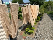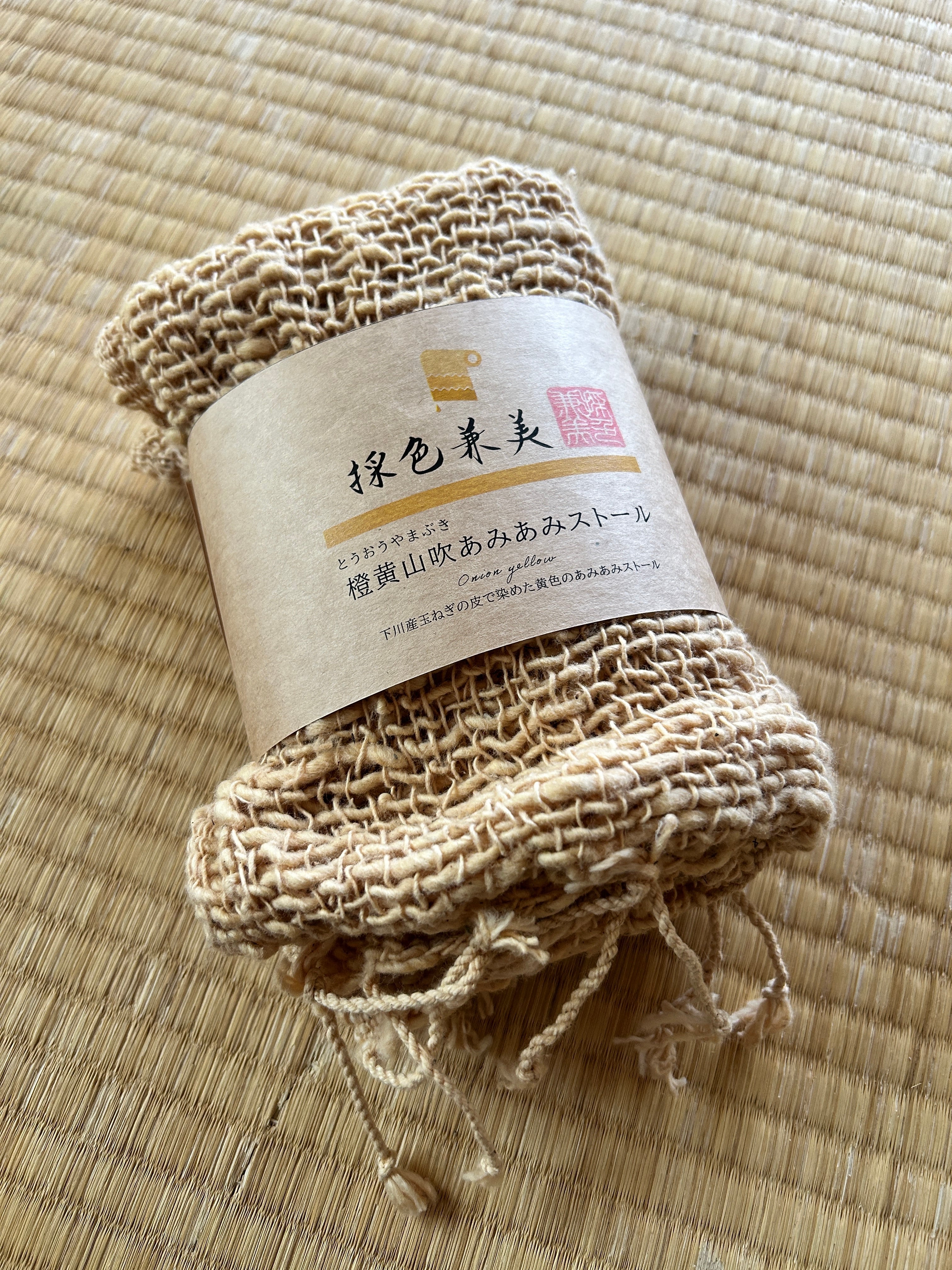 綿・羊毛のざっくり編みストールです。 下川産黄檗と玉ねぎの皮で手染めしました。 色は、穏やかな黄色。 黄檗山吹(きはだやまぶき) 草木染めならではのやさしい色合いで、 年齢を問わずお洒落に決まるあみあみストール! 生地は、ラフに編まれていて、 ふんわりと巻くことができます。 小さく畳んでカバンに入れておくと、エアコンの冷えすぎや涼しい夕方など、さまざまなシーンで活躍します。 《素材・材料》 ・布地:綿、羊毛 ・染料・媒染剤・助材:黄檗の樹皮、下川産玉ねぎの皮、銅溶液 ※繊細な生地のため引っかかりや摩擦にご注意ください。 《サイズ》 約180cm(両端のフリンジ含む)× 約35cm ※個体差があります。多少の誤差はご容赦ください。 《手染め・草木染め製品について》 手染め・草木染め製品は、使用していくうちに色が少しずつ淡くなり、独特の風合いが生まれます。日光や水などに晒すと色が焼けたり落ちたりしますので、その自然な変化をぜひお楽しみください。 *一点ずつ手作業で染めていますが、染めムラや色の違いなどが生じることがあります。 *ご購入後の取り扱いについては下記にご注意ください。 ・陽や蛍光灯の当たらない場所に保管してください。 ・強くこすったり摩擦があると色移りする場合があります。 ・お洗濯は、ごく少量の漂白成分が入っていない中性洗剤で、単独で短時間やさしく手洗いしてください。それでも色落ちが発生しますので、白いものや他の衣服と一緒に洗わないでください。 ・汗で変色する場合がございます。水洗いで汗を洗い流すか、薄い中性洗剤で軽く洗ってください。 == 発送について == 郵便局から発送します。 【購入の際の注意点】 ※現在、ご予約やオーダー製作は承っておりません。 ※サイズ直しや返品・交換は通常は受け付けておりませんので、詳細をよくご確認の上ご注文ください。 ※ご覧いただいている画面により、写真と現物の色が異なって見える場合があります。 ※土日祝日は営業しておりません。 ※メッセージには平日営業日の3営業日日以内の日中にご連絡を差し上げます。